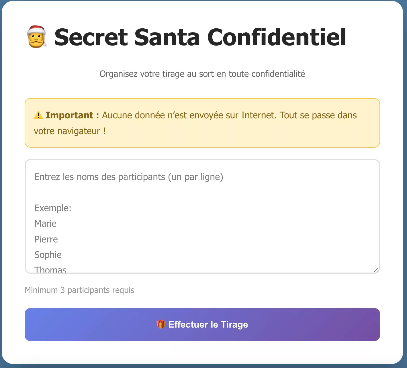 Grâce à sa structure sans collecte d’adresse email, cet outil Secret Santa offre une solution fiable, légère et privée. Il fonctionne sur tous les navigateurs, sans installation ni configuration technique. Il constitue une alternative parfaite aux sites de tirage classiques collectant vos emails.